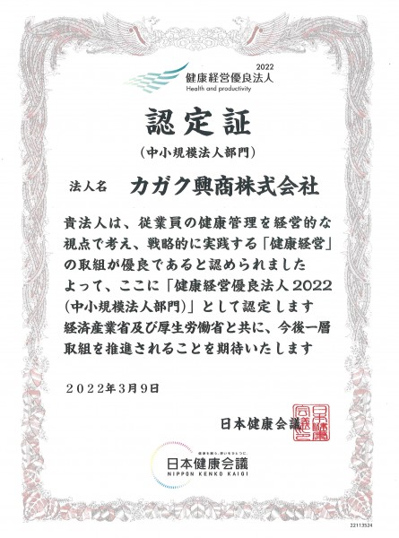 弊社が健康経営優良法人2022(中小規模法人部門)に認定されました。