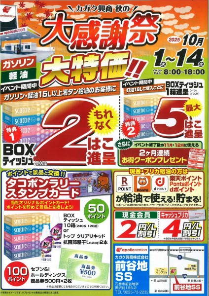 ガソリン・軽油、スタッドレスタイヤの大特価やキーパーコーティングの期間限定価格、お買い上げ記念品進呈など盛りだくさんで、皆様方のご来場をスタッフ一同、心よりお待ち申し上げております。
